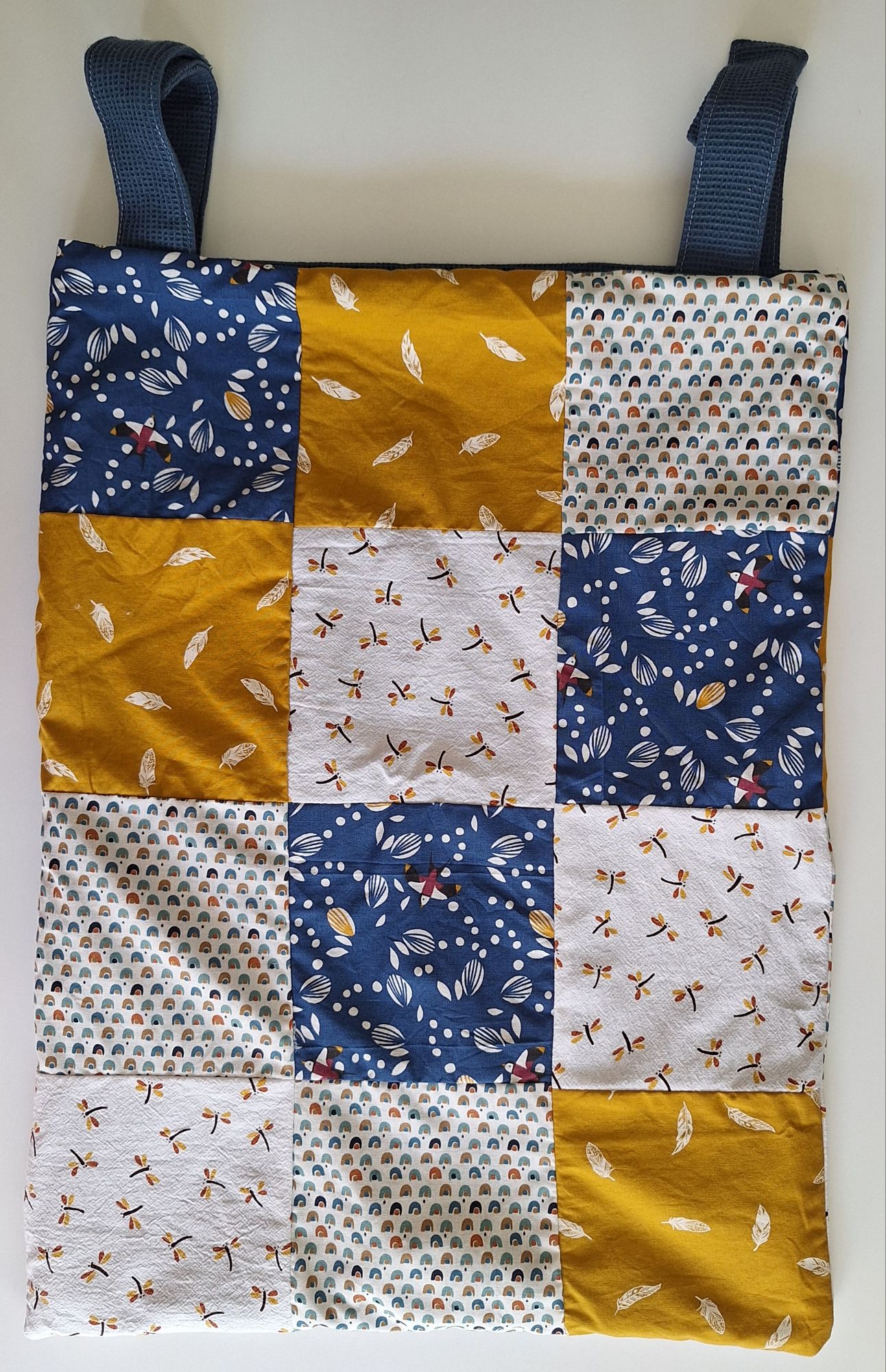 Ze hebben aan de ene kant wafelstof (de kleur van de hengsels), en aan de andere kant een patchwork van 100% katoen. De boxzak is makkelijk te draaien en daarom aan beide kanten te gebruiken.